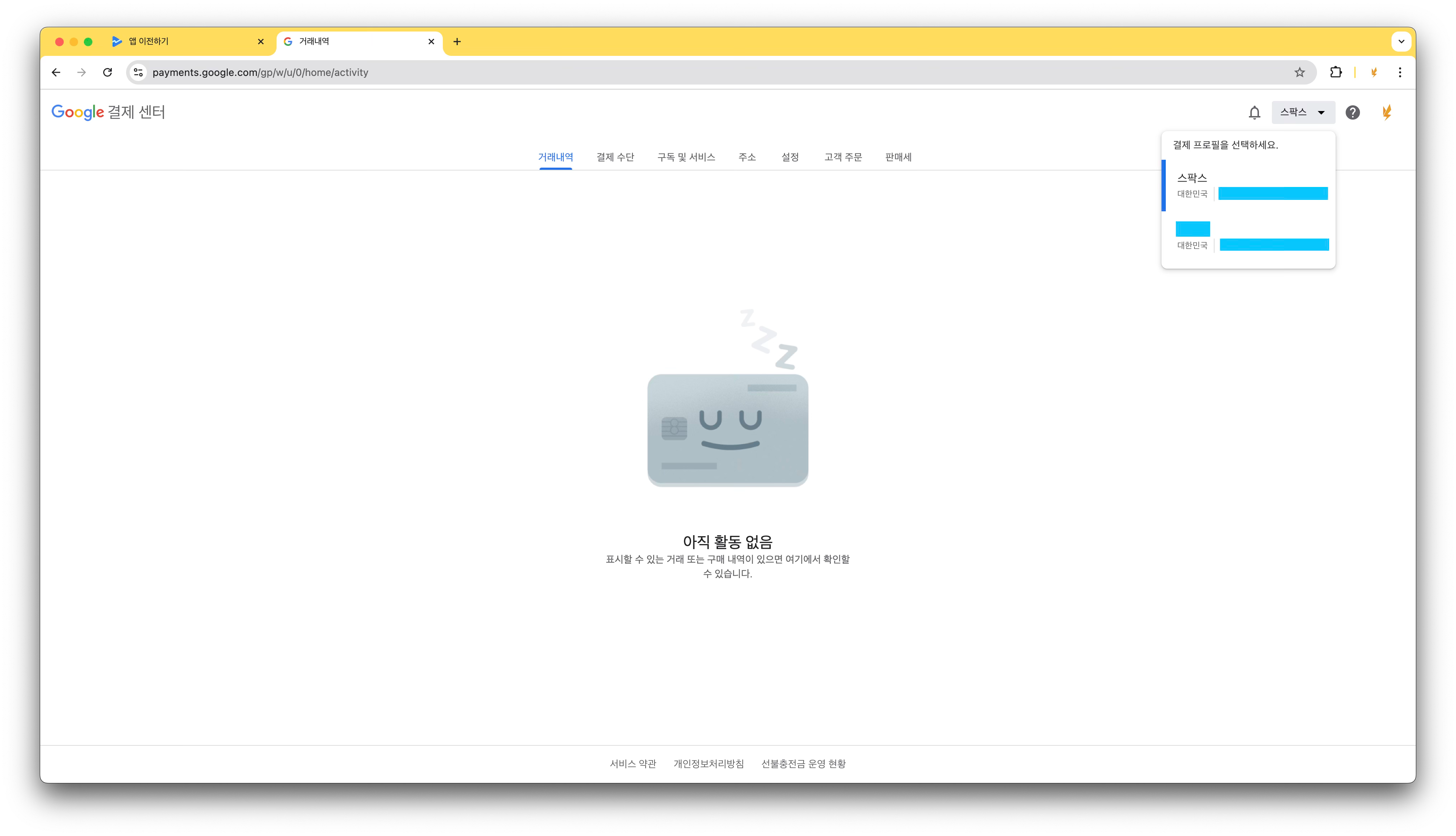 위 링크에 접속합니다. 이때 “아직 활동 없음”이라고 조회되어도 오른쪽 위에서 알맞는 프로필을 선택하면 구매 내역을 확인할 수 있습니다. 저희 SPARCS의 경우 Google Play 게시용 결제 프로필과, 실제 결제용 담당자 프로필이 분리되어 있었습니다.